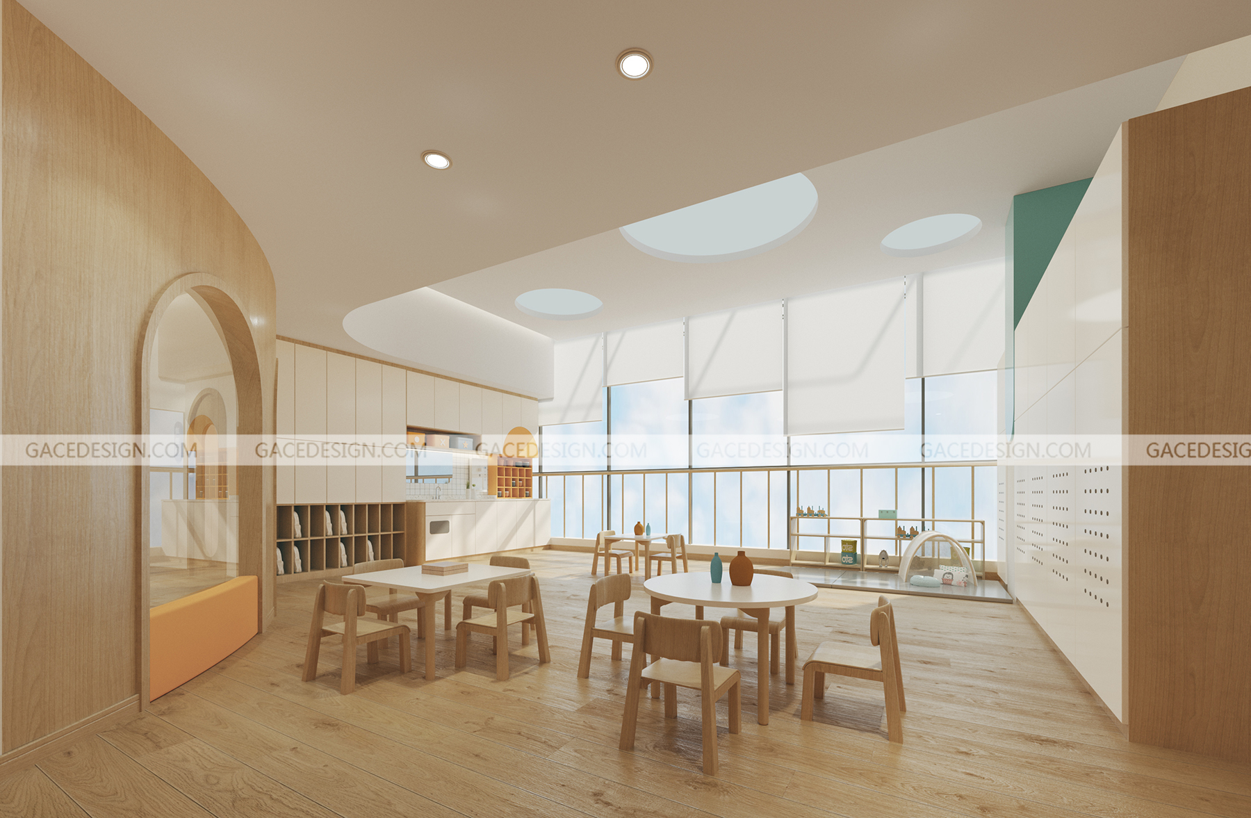 設計概括:作為浙江省臺州&嘉興市的第一批示范性且根據托育設置標準建設的盈利性高端托育園,總面積700&1000平。我們把設計重點放在了教育理念和兒童心理層面上。空間中除了功能性,以滿足孩子們的日常食宿,需要更多的可拓展性。場地為純粹的室內空間,而幼兒天性的釋放往往在戶外。如何將戶外元素與功能性結合,我們想到用建筑思維來解構空間,讓空間立體而生動。結合陳鶴琴老先生的教育理念,我們在室內設計了富有親和力、天然感的兒童探索洞穴和一條無邊界的跑道。