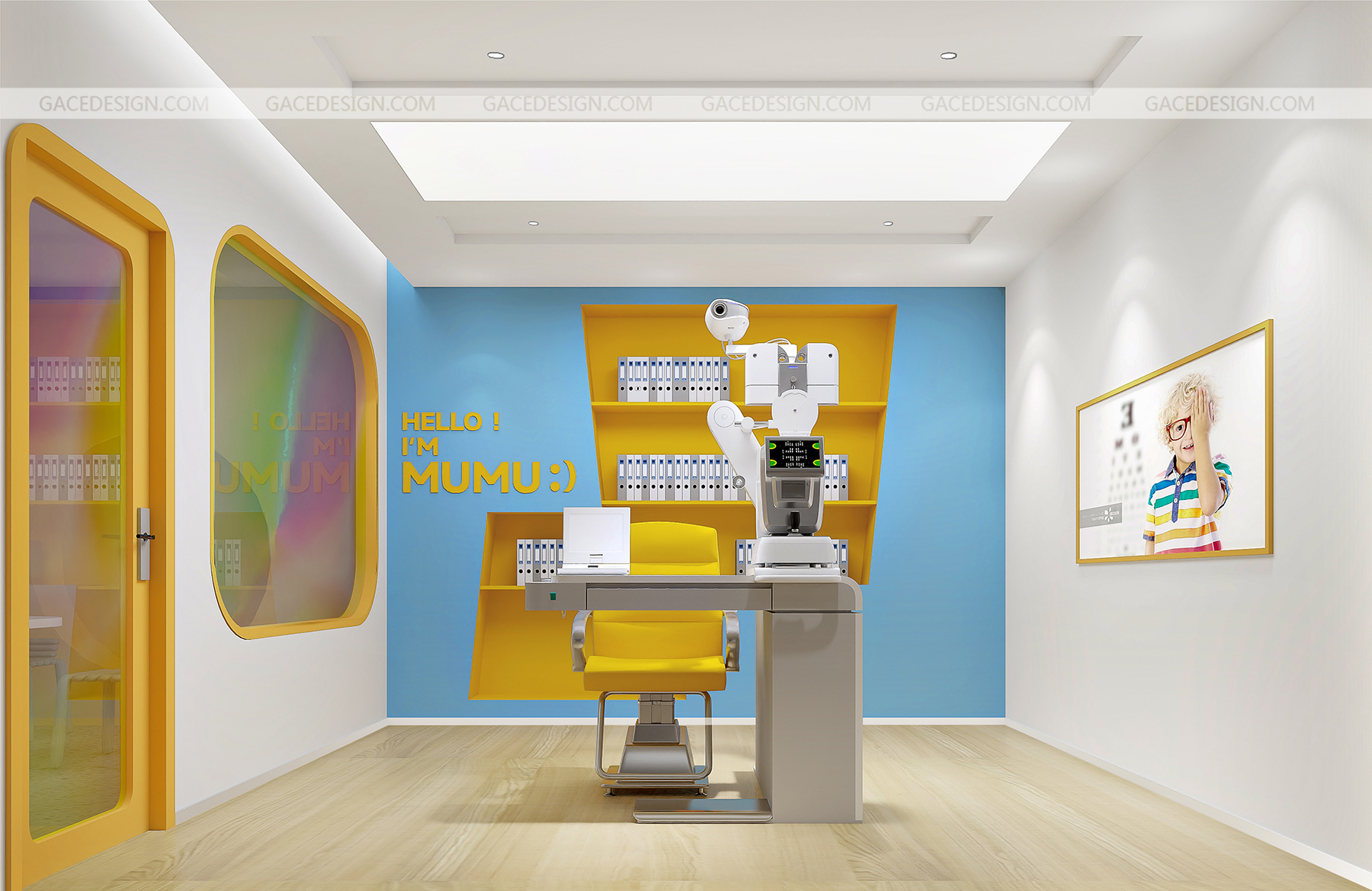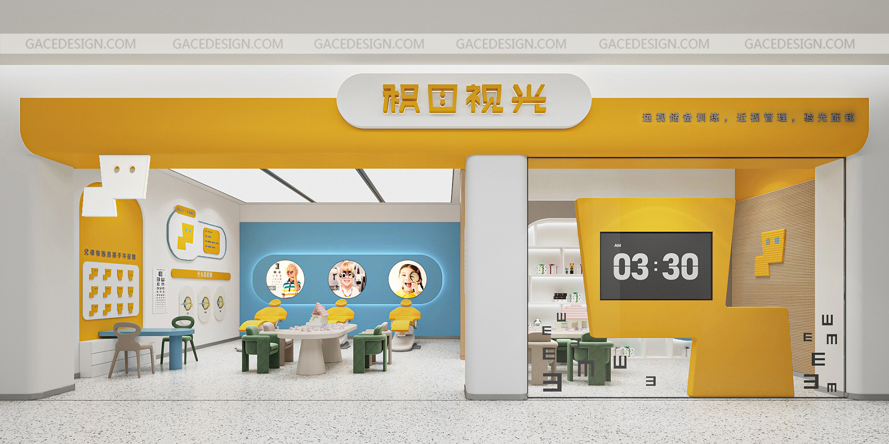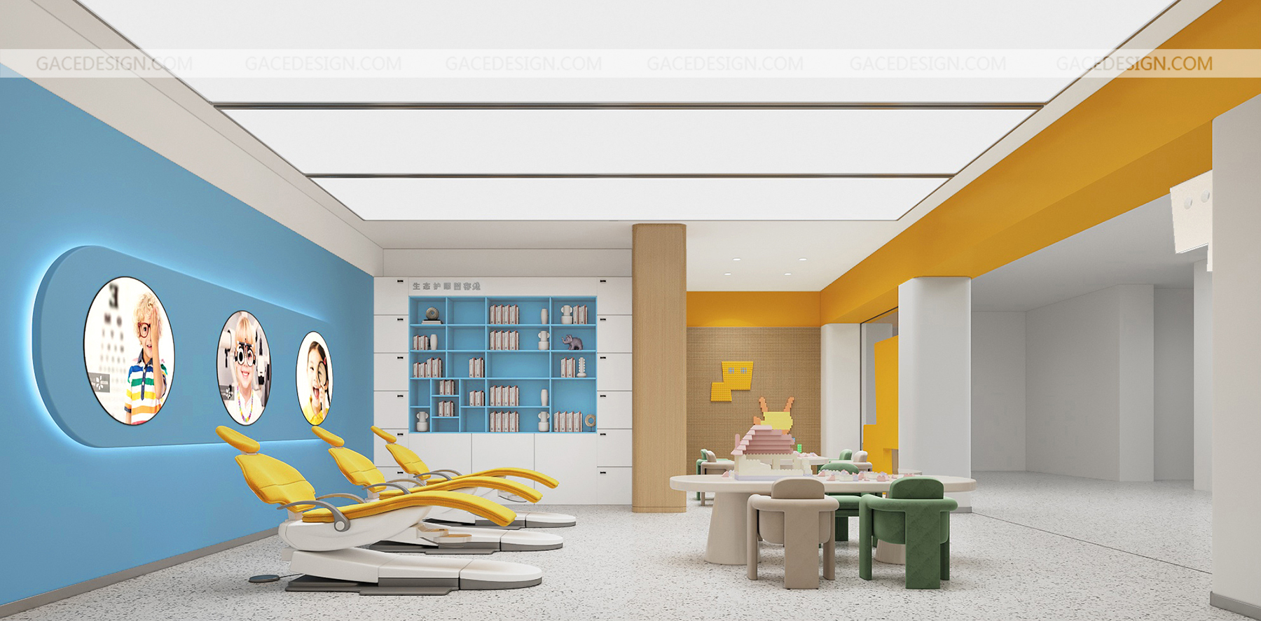 設計說明:將品牌IP最大化融入到空間。以鮮明的品牌形象色,傳達了引領行業趨勢的新理念。友好的圖形具象化,強烈的對比色在市場打出差異化。讓整個場景與兒童體驗起來更生動有趣。,所有的尺寸根據兒童的人體工學進行搭配。每一個小細節都對兒童友好。一切都是圓的,沒有可以撞到的角落。