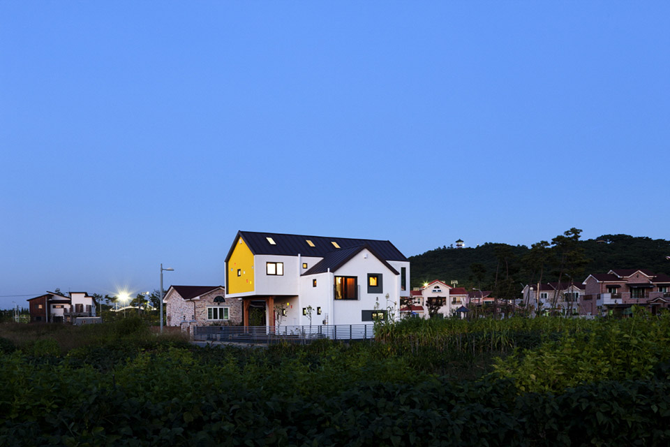在韓國的益山州市有一棟英文字母“T”型的房子,這棟房子是采用30里面后的膠合木建筑的全木質(zhì)住宅,在T字的兩個端頭被挑起,分別的形成了入口門廊和客廳的花園休閑平臺,一層為開放的大空間,包含了起居室,廚房和餐廳,第二場則是私人空間,設(shè)有書房,游戲廳和臥室等房間。