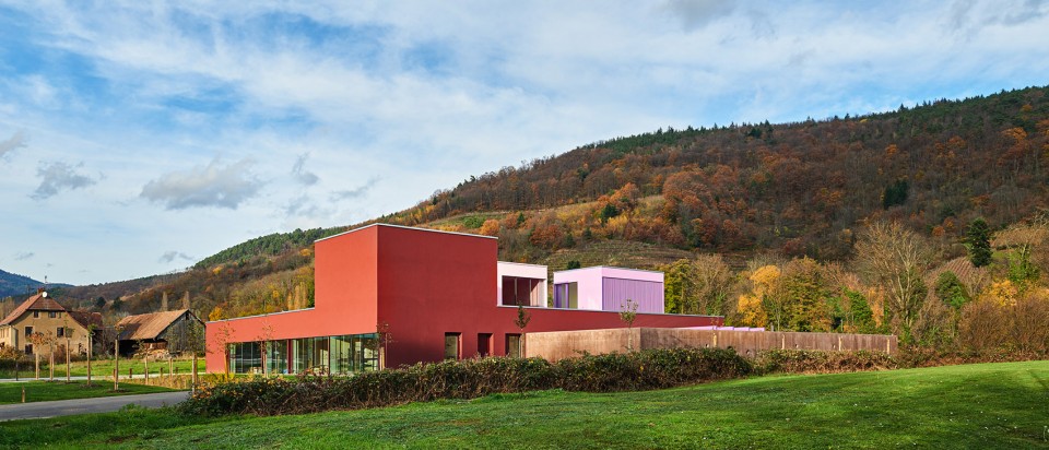 位于法國阿爾薩斯省一個(gè)小村莊的山谷入口處,建造著一所就像是用積木搭建兒童的樂園,環(huán)繞著幼兒園的蘋果樹和邊上連綿起伏的山丘隨著四季的變化成了幼兒園一道特別的背景,沿著幼兒園的邊界還有一條圍墻,墻上有著大小不一的圓孔,可以透過這些圓孔去看到外面的世界,這個(gè)很有趣的設(shè)計(jì)可以提供一些有趣的感覺,滿足了孩子們的好奇心,而這面有趣的圍墻則如同衛(wèi)士一樣默默守護(hù)者在自由玩耍的可愛孩子們。