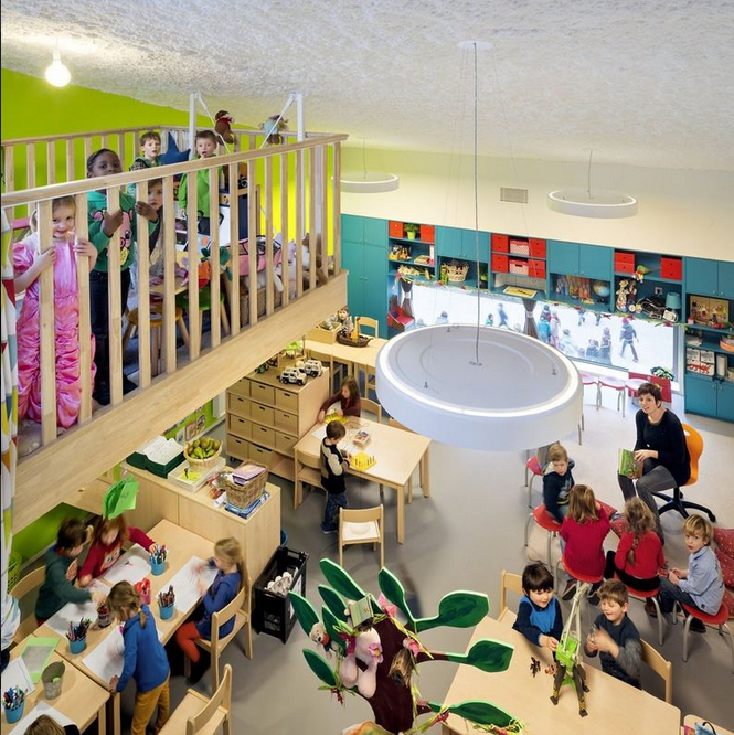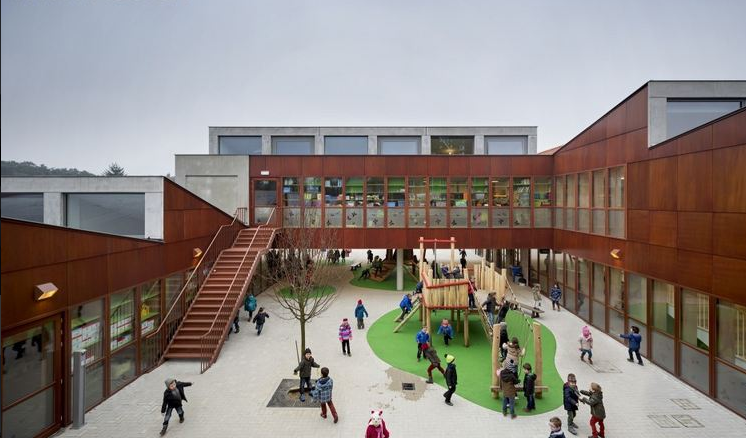 在老建筑和新學(xué)校建筑通過(guò)一個(gè)“回廊”相連。這個(gè)“回廊”位于院子周圍,提供通道可以進(jìn)入所有房間。這個(gè)院子容納了操場(chǎng)。小學(xué)建筑也被保留。新老建筑結(jié)合的結(jié)果形成了令人興奮的安全的環(huán)境,適于小孩玩耍和學(xué)習(xí)。(幼兒園室內(nèi)設(shè)計(jì))