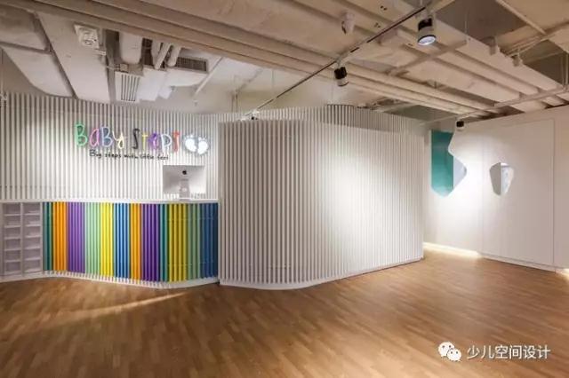 幼兒樂園的入口處設置了透明的玻璃門,純白色的金屬百葉窗,簡潔利落的百葉窗顯得美觀大方。入口的一側還設有接待臺,同樣是由柔和彎曲的彩色百葉窗造型設計而成。Babysteps的標識置于接待臺后面的墻上,五彩的字體設計更顯活潑可愛。燈光打在百葉窗上形成微妙的光影,使得BabySteps產生了一個工藝的視覺形象。