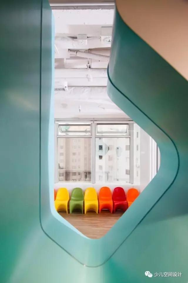 緊鄰的休息室是由鋸齒狀的三層平臺形成的區域,建在房間的一個角落,靠著窗臺玻璃幕墻的邊緣,并沒有占用孩子們的游戲區。無論是欣賞孩子學習的成果,還是日常點滴的進步,休息區都為家長提供了一個完美的視角去觀察孩子。