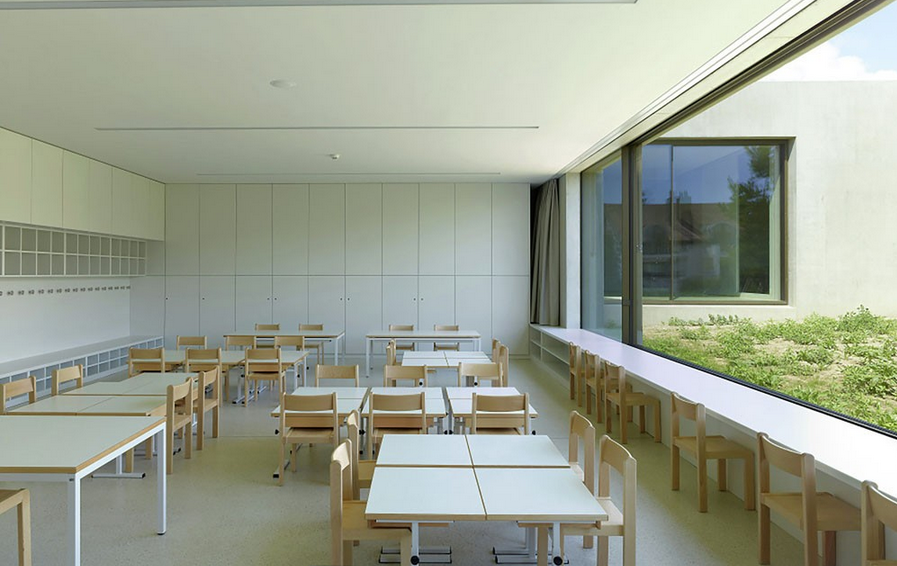 六間教室兩兩一組,分別布置在三個不同體量中,樓梯則作為基礎性結構設施布置在建筑中央位置。人們可以通過斜向的坡道進入建筑,同時這條坡道也是幼兒園的內部入口。