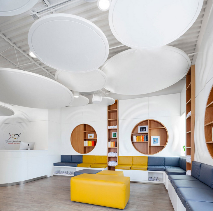 樓梯井和二樓的接待區中裝有電腦數值控制制成的漆面板,其中藏有儲物柜、引導標識和照明器具。圓形的波紋圖案組成了一個色彩豐富溫馨的圖書室,設有舒適的座椅和社交空間,人們可以安靜地閱讀書籍,做伸展訓練,或是和朋友加深交流。