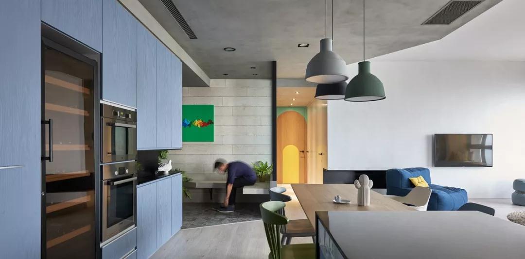 所有這些都散發(fā)出一種寒冷的感覺。高大的天藍(lán)色木紋櫥柜與斯堪的納維亞枝形吊燈的混凝土表面相配,給空間增添了些許溫暖。